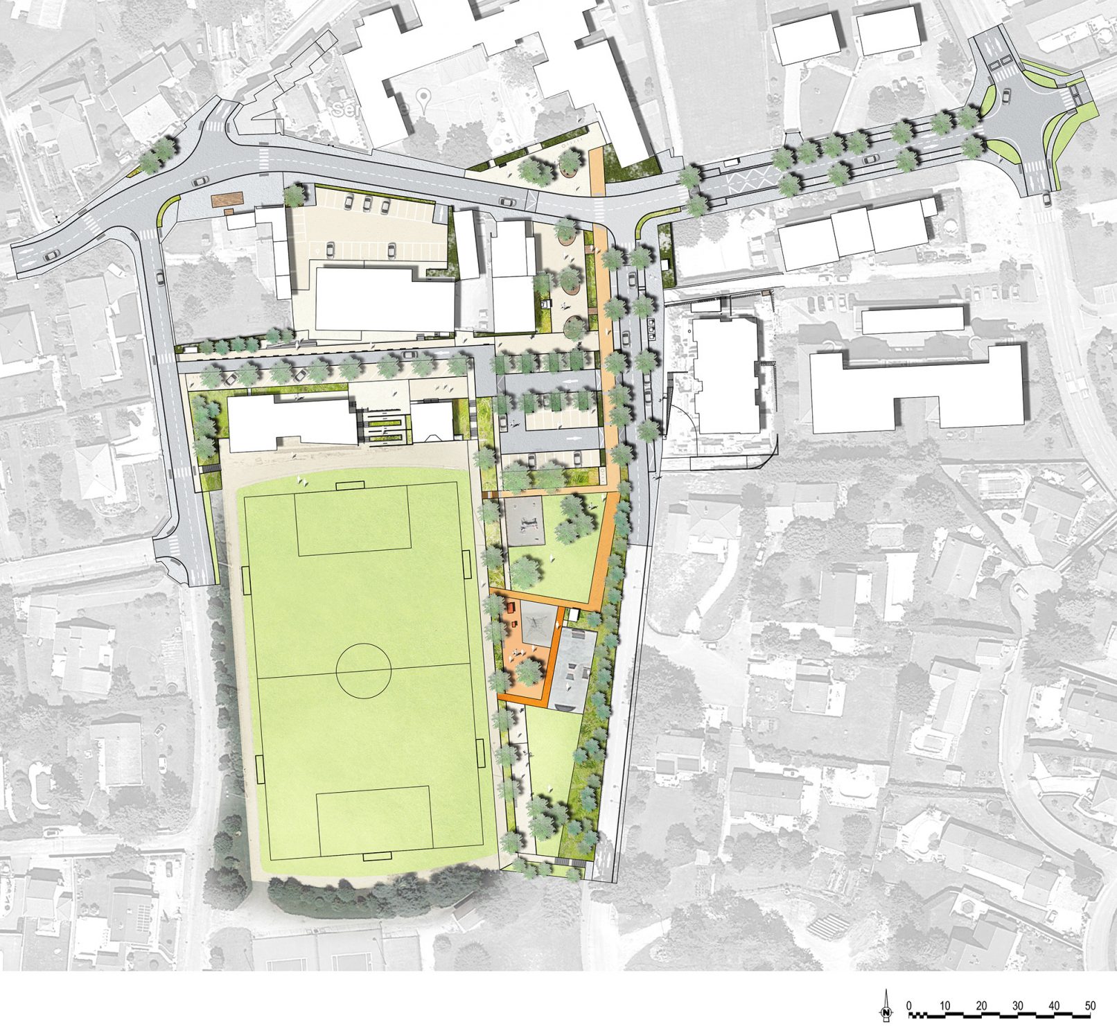 Pour lui créer une identité forte et valoriser les éléments existants (médiathèque, mairie, aires de jeux,…) le projet articule deux compositions. L’axe Nord-Sud relie les écoles au parc de jeux. Il enchaine les espaces publics et trouve une continuité naturelle grâce à un large cheminement piéton de couleur orangée. L’axe Est Ouest est traité de manière très ouverte afin de faciliter la réalisation de manifestations publiques d’ampleurs. Le parc est réorganisé autour des éléments déjà présents mais éparpillés, pour offrir une image plus lisible. Pour cela, les cheminements retendent des lignes de construction claires qui s’étendent vers les espaces publics alentours. Les places de la mairie et de l’école sont traitées dans un esprit de convivialité qui se manifeste par la réalisation de petits salons urbains.