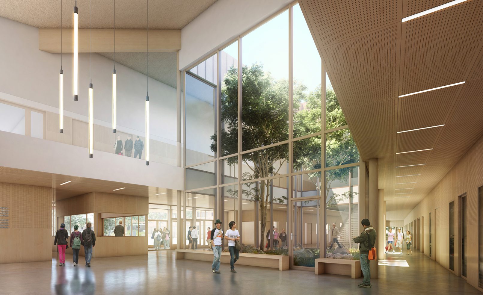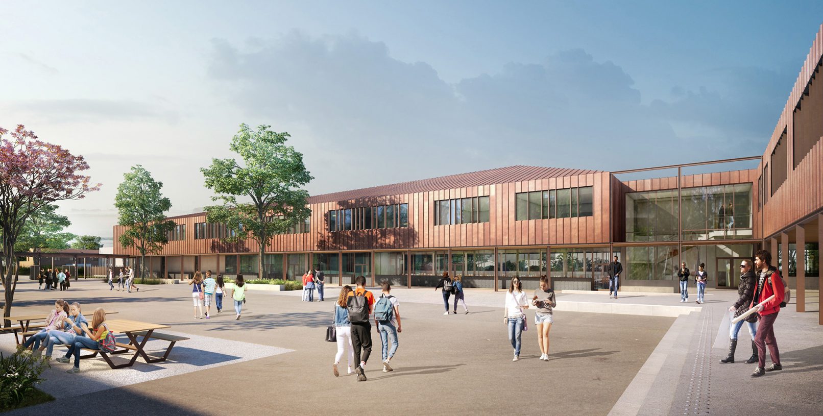 En entrant dans l’établissement, les élèves découvrent une vaste cour ouverte. Au Sud, des « salons urbains » permettent de changer d’échelle et apportent une réelle convivialité avec des tables de ping-pong, des bancs béton aux formes organiques courbes ou des tables de pique-niques.