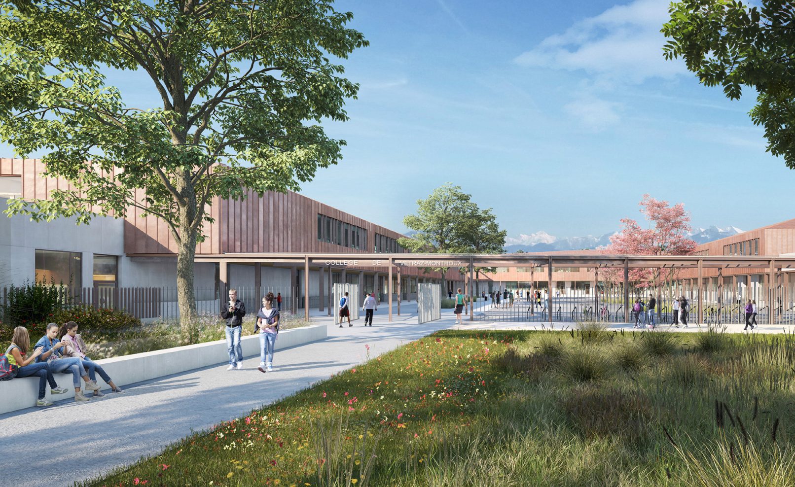 Le projet paysager appuie sa composition sur un grand parvis longiligne qui articule le collège, le futur gymnase et les nombreuses connexions mode doux.