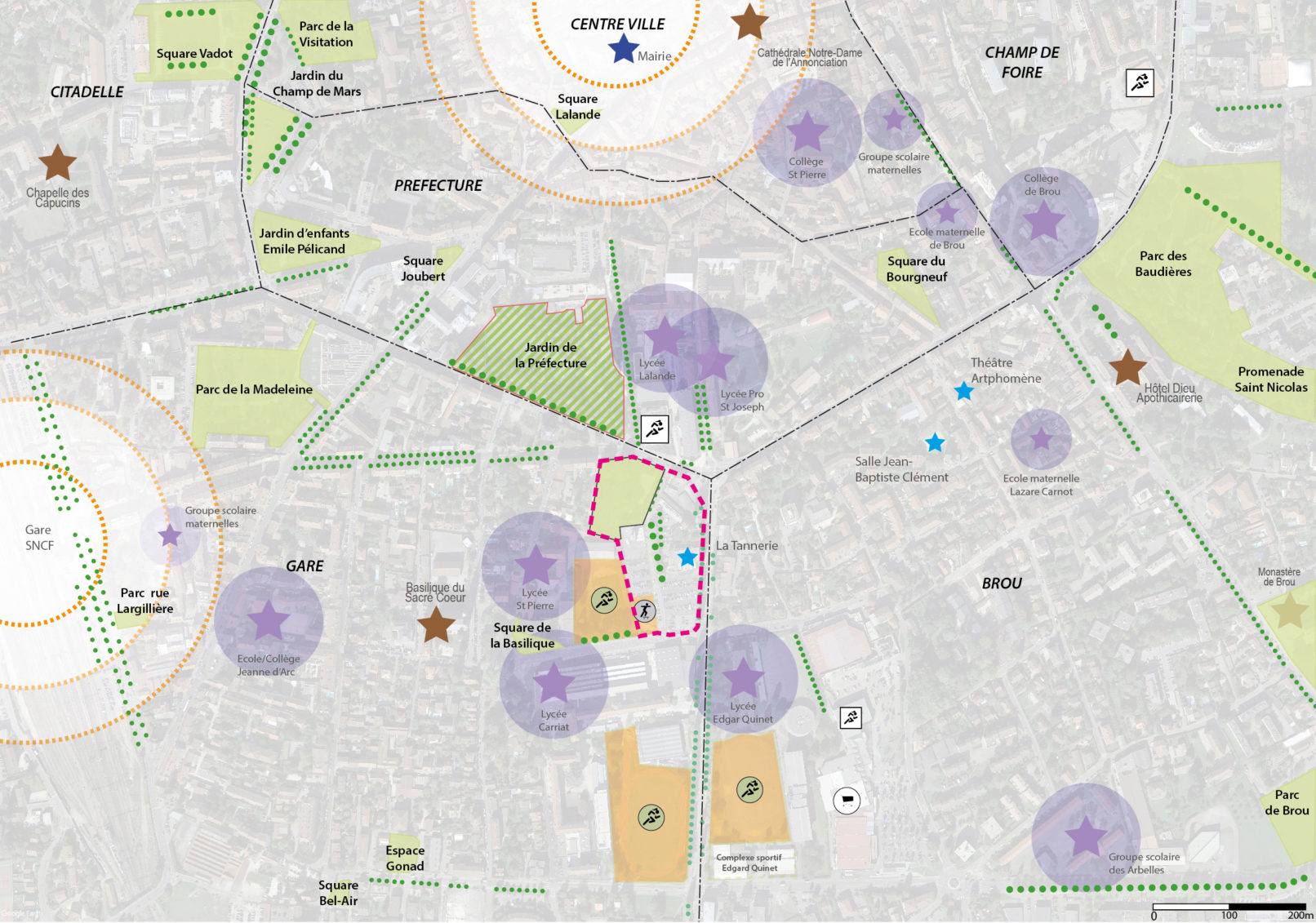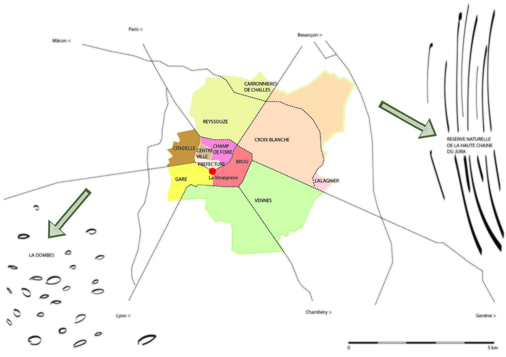 Le secteur urbain de la Vinaigrerie est un site rotule entre le faubourg et le cœur de ville de Bourg-en-Bresse. Les quartiers alentours regroupent une grande diversité d’équipements publics, de points d’intérêts culturels, sportifs ou d’espaces verts. Cette offre participe à l’attractivité du secteur Vinaigrerie.