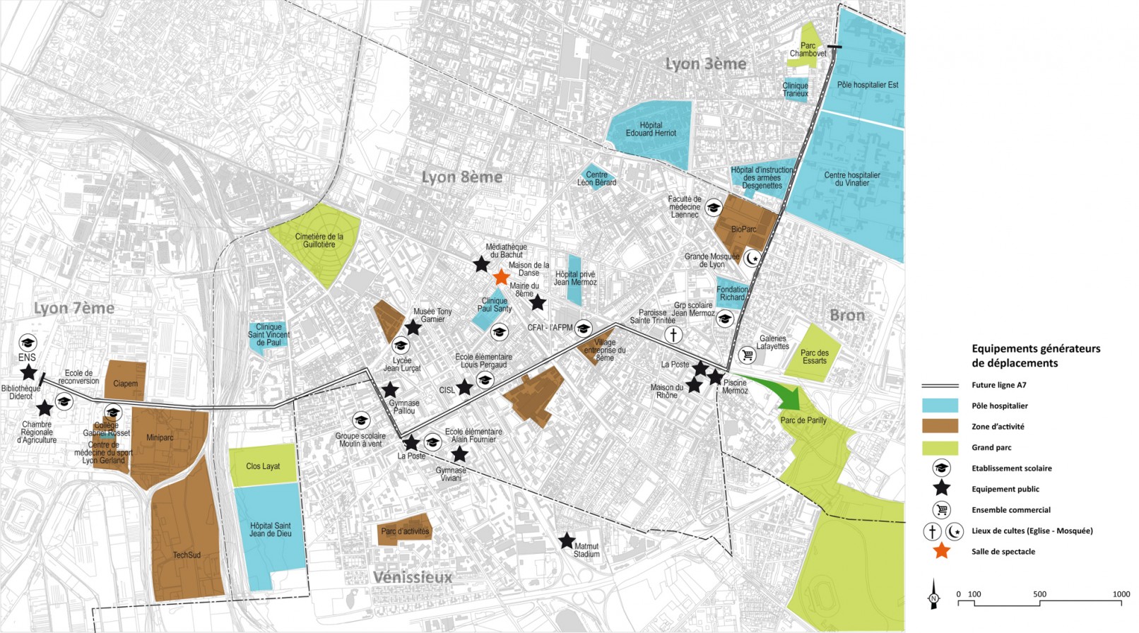 Dans une 1ère étape (A7 phase 1), la connexion avec 2 lignes de métro et 4 lignes de tramway offrira une formidable opportunité de maillage du territoire, renforçant l’attractivité du réseau, là où des parts de marché TC peuvent encore être gagnées. A terme, cet effet sera amplifié avec la poursuite d’A7 jusqu’au Nord sur le campus universitaire de la Doua, ajoutant de nouvelles connexions avec la ligne A de métro et le tramway T3.