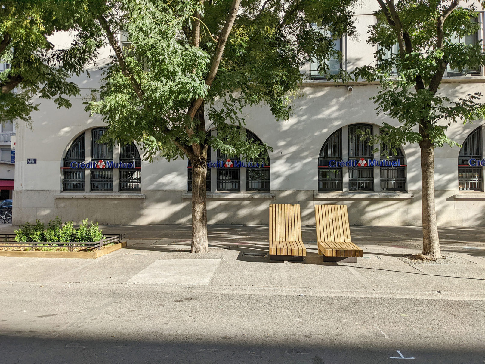 Nous axons notre projet sur la recherche d’espaces de convivialités en dessinant des assises inspirées par l’architecture des lieux. En complément, une importante végétalisation de l’avenue est entreprise. Elle se fait par l’intermédiaire de pots, eux aussi desinés sur mesures, et la désimperméabilisation de nombreux pieds d’arbres.
