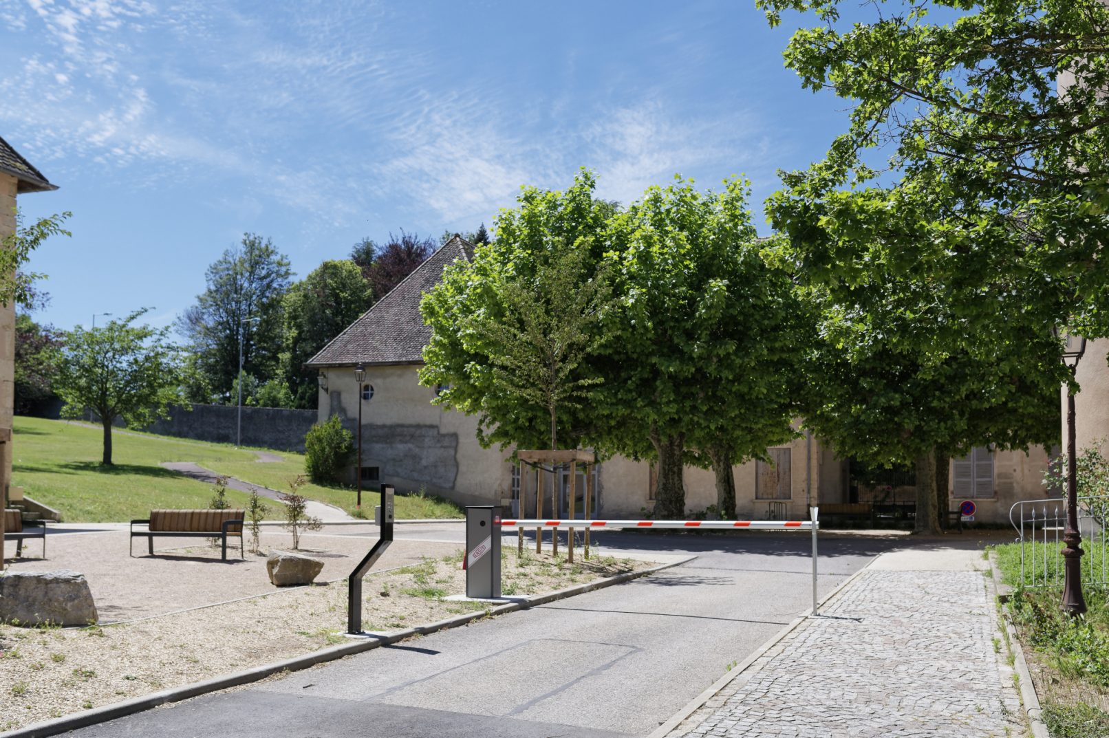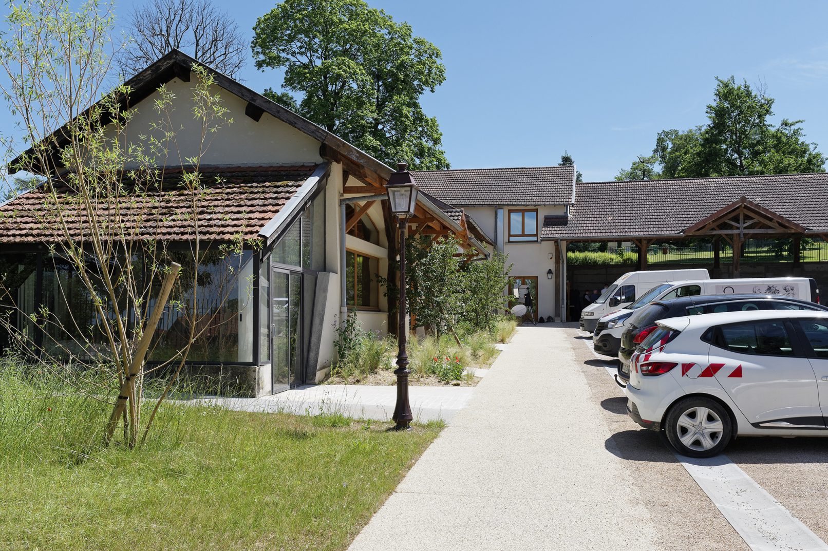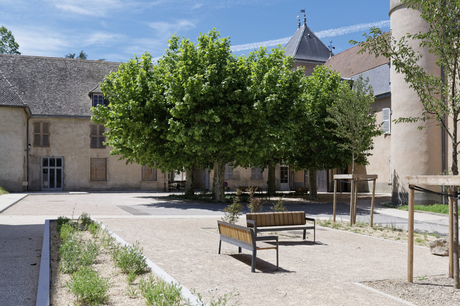 Les abords des bâtiments sont valorisés par des compositions végétales et les entrées sont marquées par des pavés de calcaire, clin d’œil aux bâtiments historiques.