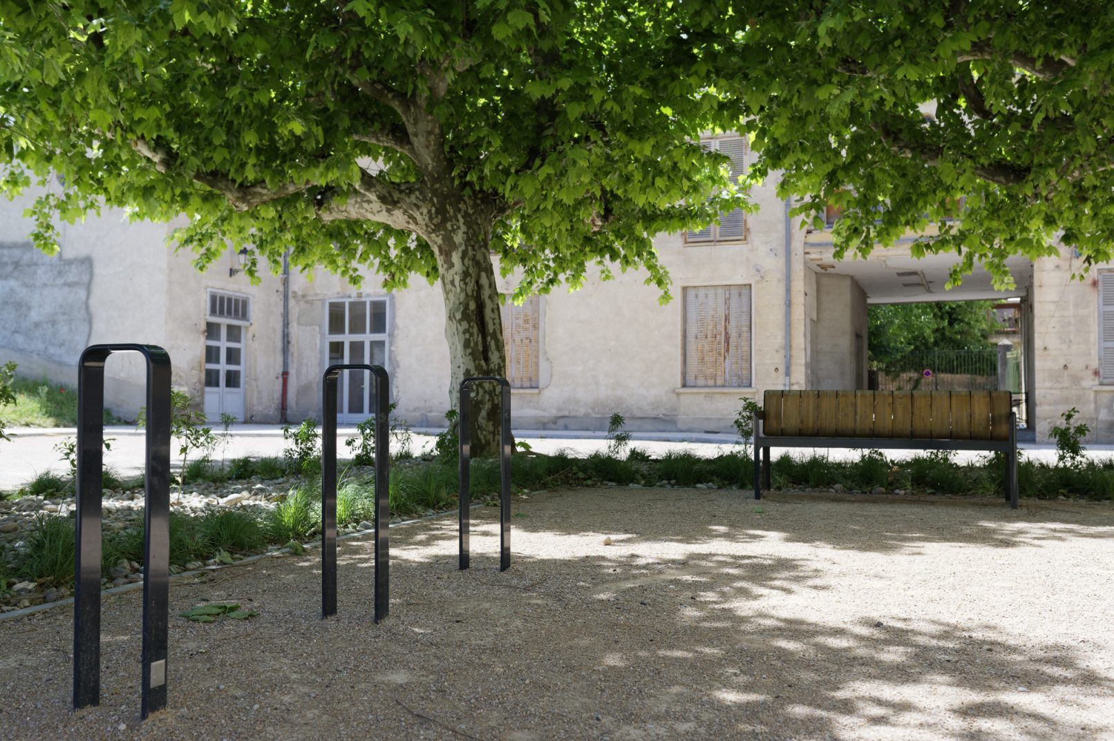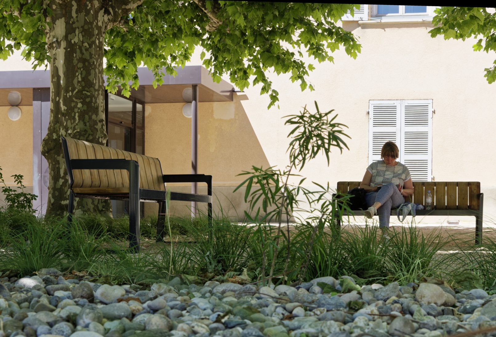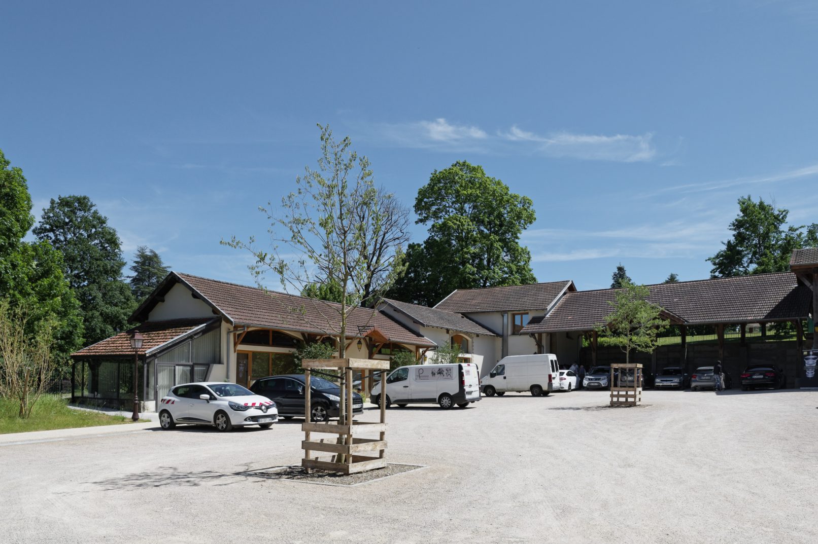 Les abords des bâtiments sont valorisés par des compositions végétales et les entrées sont marquées par des pavés de calcaire, clin d’œil aux bâtiments historiques.