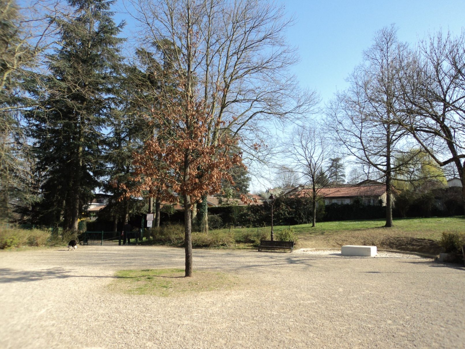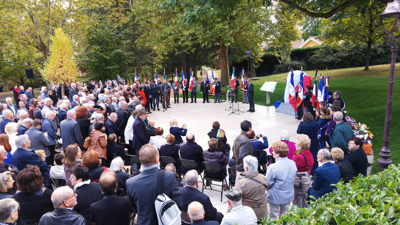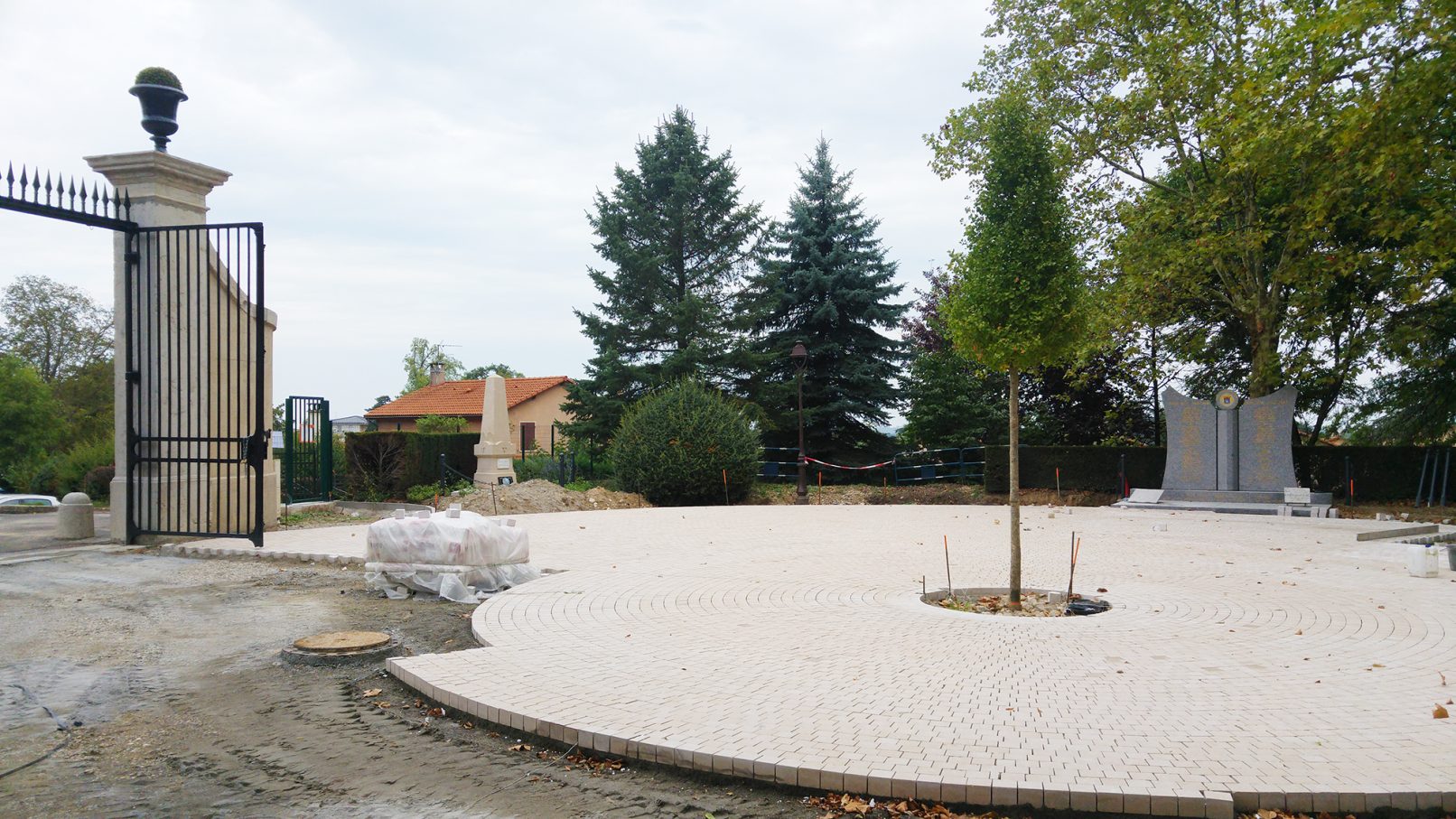 L’entrée sur le parc est re symétrisée et adopte un pavage circulaire. Cadrée par un modelé du sol très épuré, cette première pièce est empreinte de la sérénité adéquate à la présence des deux stèles commémoratives.